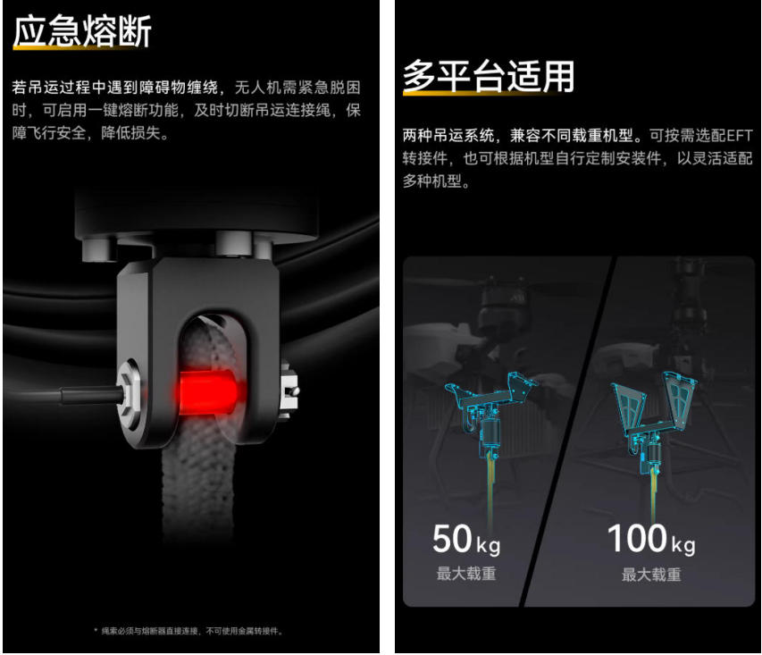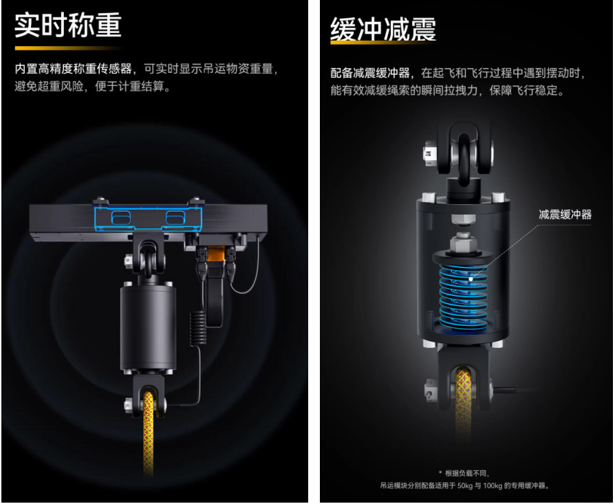 专为物流运输场景深度优化,机身预留多组传感器接口与数据传输通道,实现吊运/运输物资实时定位、状态监控及物流数据回溯。配套完善的地面调度平台与运维体系,适用于乡村物资吊运、城市小件货舱配送、应急物资投送及仓储间货物转运等场景,助力物流行业提升运输效率、降低人力成本,构建智能化空中物流网络。