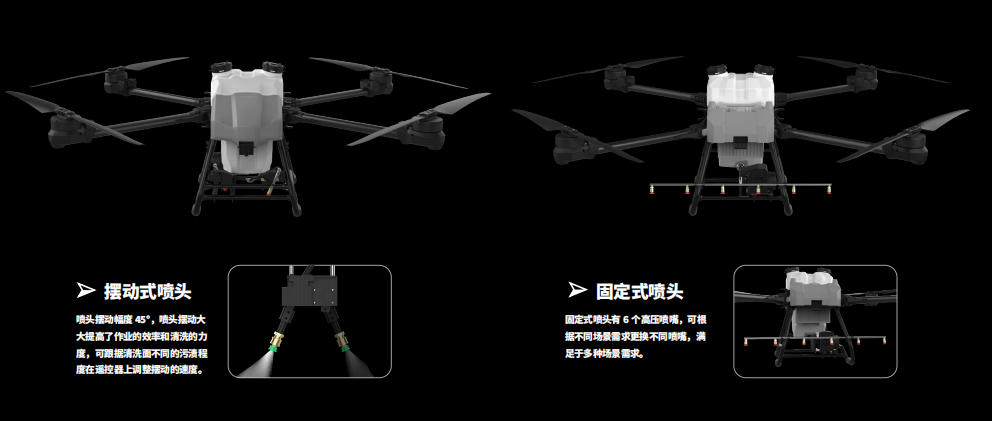 清洁无人机模块化设计,可适配两种不同的清洗挂载,有固定式、摆动式喷头,搭配高压喷嘴设计满足多样清洗需求,为行业提供便捷高效、多